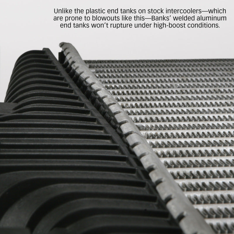 Techni-Cooler provides the maximum reduction in boost air temperature with a minimal loss of boost pressure. Cooling the air makes it denser and more oxygen rich, improving combustion and engine efficiency. Result: higher continuous power and more power at any exhaust gas temp (EGT), better fuel economy and lower EGTs. What could be cooler than that? Mounting hardware included. Banks Techni-Cooler Intercooler system includes mandrel-bent 3 inch high-flow boost tubes... large, high-efficiency all-aluminum end tanks instead of the wimpy stock plastic ones that can rupture under high-boost conditions... a high-flow inlet that distributes air evenly across the intercooler for an 18% increase in flow and more effective cooling... a wide-open outlet... and a thicker core area with impressive volume. Eliminates restrictions, dramatically increasing the cooling capacity for massive continuous power. Big aluminum end tanks won't burst like the plastic stock ones.;NOTE: Fits trucks built in 1999