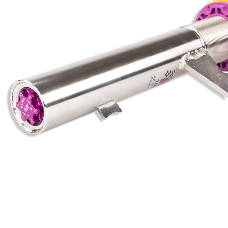 Cutting-edge motorsports technology -or more performance on the road. Like every suspension product developed by KW automotive and manufactured in Germany, the KW Variant 3 Coilover suspension kit also provides a significant improvment on the road. Thanks to the high-quality dampers, springs, and elastomer spring elements, pitching and rolling movements during load changes such as evasive maneuvers, cornering, acceleration, and braking are significantly reduced. The braking distances are also shortened. Thanks to improved support and feedback, drivers not only feel more confident but driving in everyday life is improved. With compression and rebound stage damping, that can be set separately and independently of each other, the damper setup can be customized to your personal driving preferences or vehicle changes such as weight, tire characteristics, or altered vehicle rigidity. True performance optimization is only possible with this unique, patented system. For example, this allows the compression damping force to be increased and get more grip from the tires, to improve cornering behavior and reduce squat without simultaneously altering the rebound stage damping which is optimally matched to the spring rate ? a scenario which results in reduced grip and the associated loss of performance. The KW Variant 3 INOX-LINE coilover kit is the ideal tool for performance-oriented drivers and experienced tuning enthusiasts who place a strong emphasis on the overall performance of their suspension. The Variant 3 features patented TVR-A and TVC-A technology -hat provides separately adjustable rebound and compression damping. The extensive Adjustment -ange of the independently configurable rebound and compression make it easy to directly influence the steering behavior, directional stability, grip and handling characteristics for confident and repeatable results at the limit of driving dynamics.